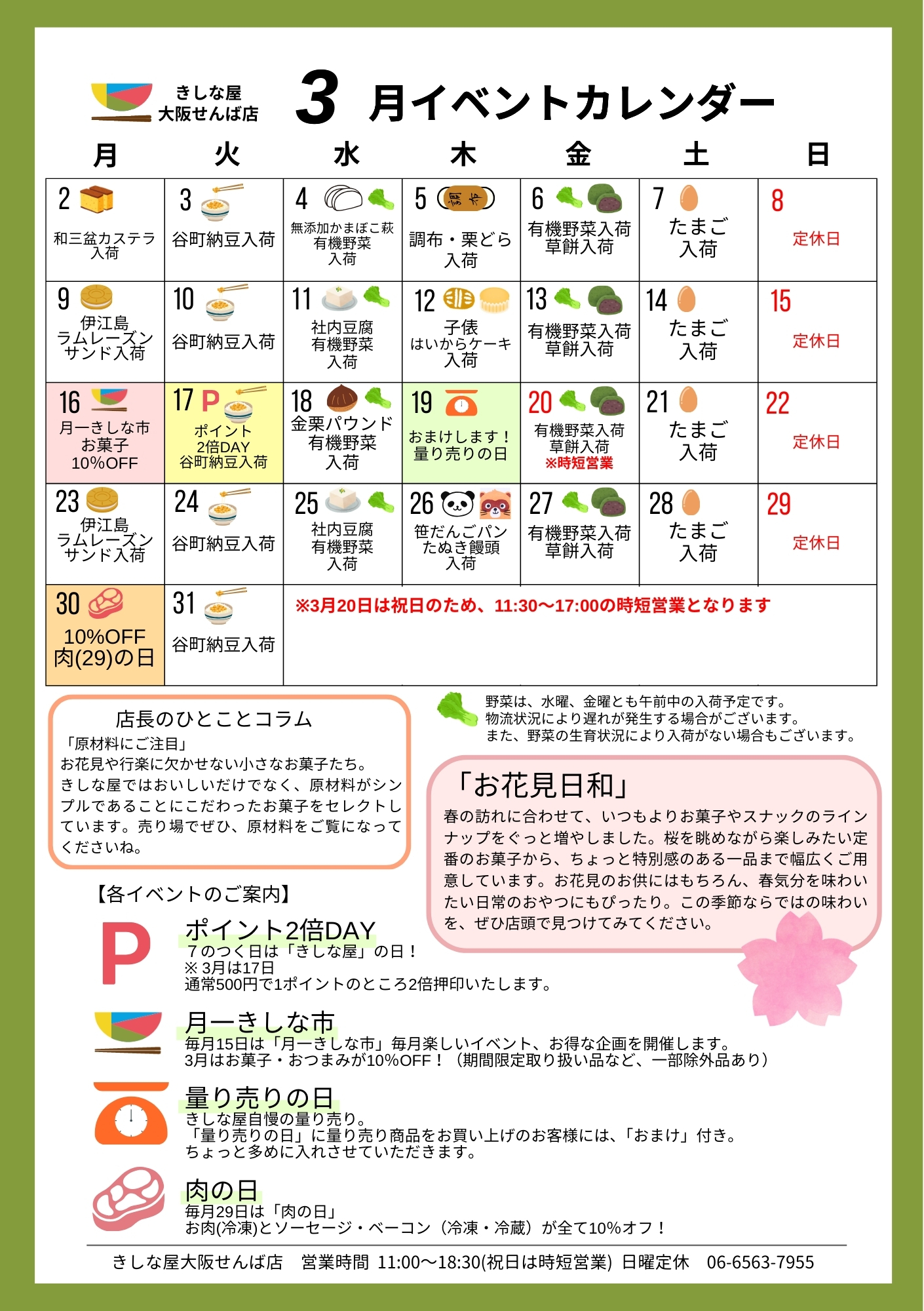 「月一きしな市」は、ほんまち店、大阪せんば店とも「お菓子10%OFF」(一部除外品あり)です。